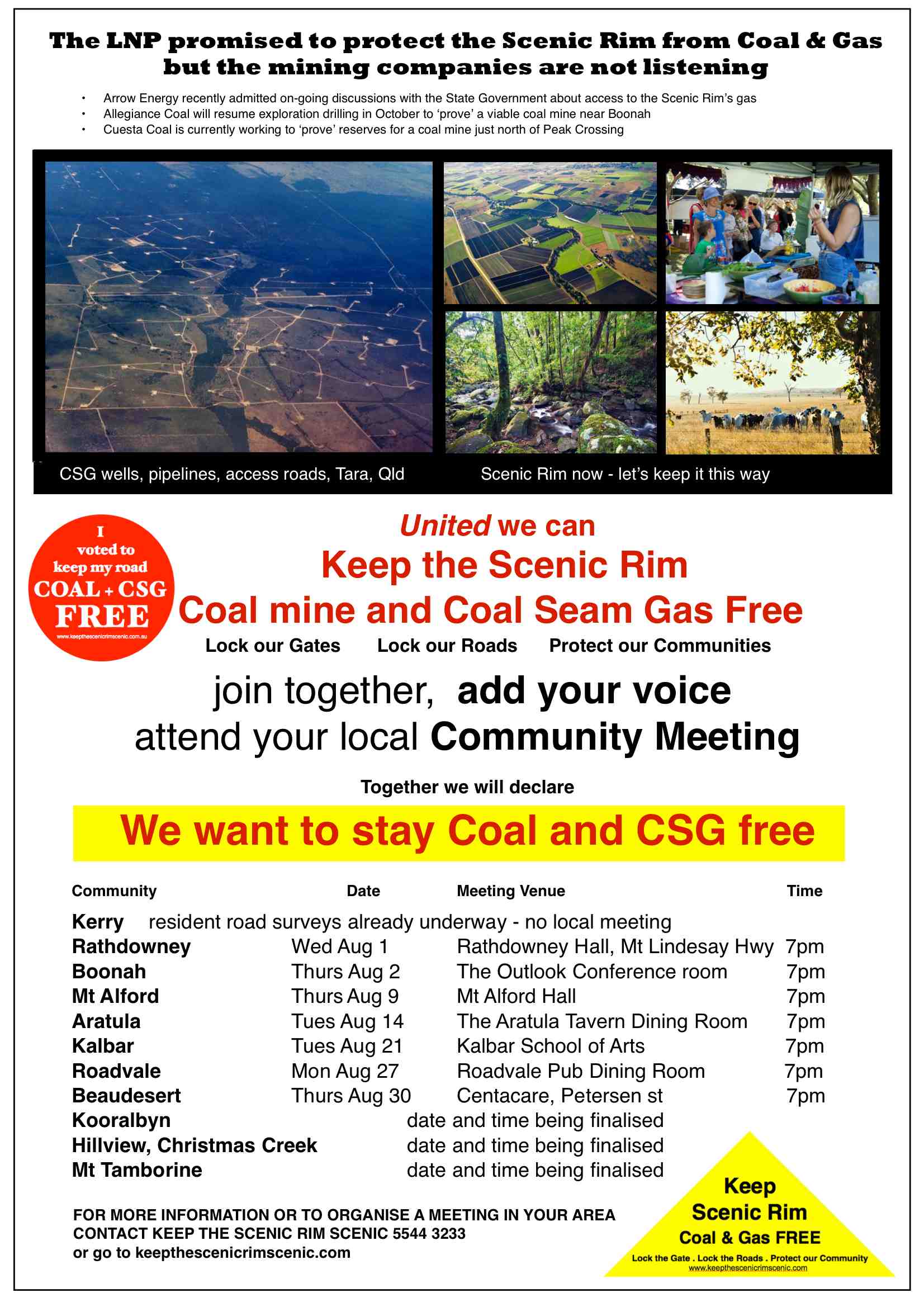 Slowly, slowly, road after road are declared Coal and CSG Free and that then allows the locality or village to also be declared Coal and CSG Free by the Community. In northern NSW, there has been an overwhelming 98-100% vote in favour of protecting communities and farmlands from gas.